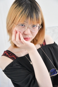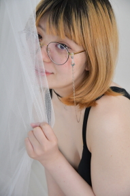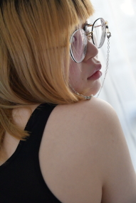大き目のフレームの丸眼鏡に眼鏡チェーン、ぽってりとした唇がチャームポイントの彼女、事前にお会いした際にぜひとも出演してほしい、と今回の撮影のご依頼をしました。