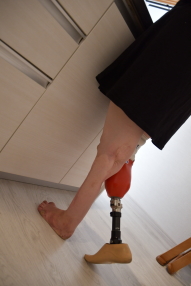 「左足は親指を切断する際に医師から『歩きづらくなるかも』って言われました。踝の関節も固定されているんですが今現在はずいぶん慣れましたね。右足の義足も夏場はこすれちゃったりして痛くなることもありますがこっちも慣れました。お家だと義足なしでいることも多く、だいたいのことは膝立ちか四つん這いで移動してできるようになったんですよ」